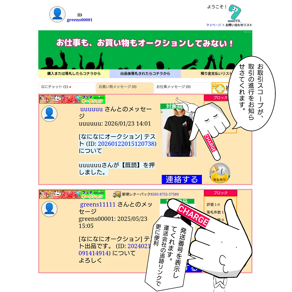 【お買い物メッセージ】は、購入側、販売側の取引に特化した機能を装備しております。機能としては、取引している商品写真、支払決済、発送番号表示、追跡、取引状況がわかるステッカー表示、商品確認写真掲載などを兼ね備えたページです。(取引後の商品の苦情対応にも特化しています。)